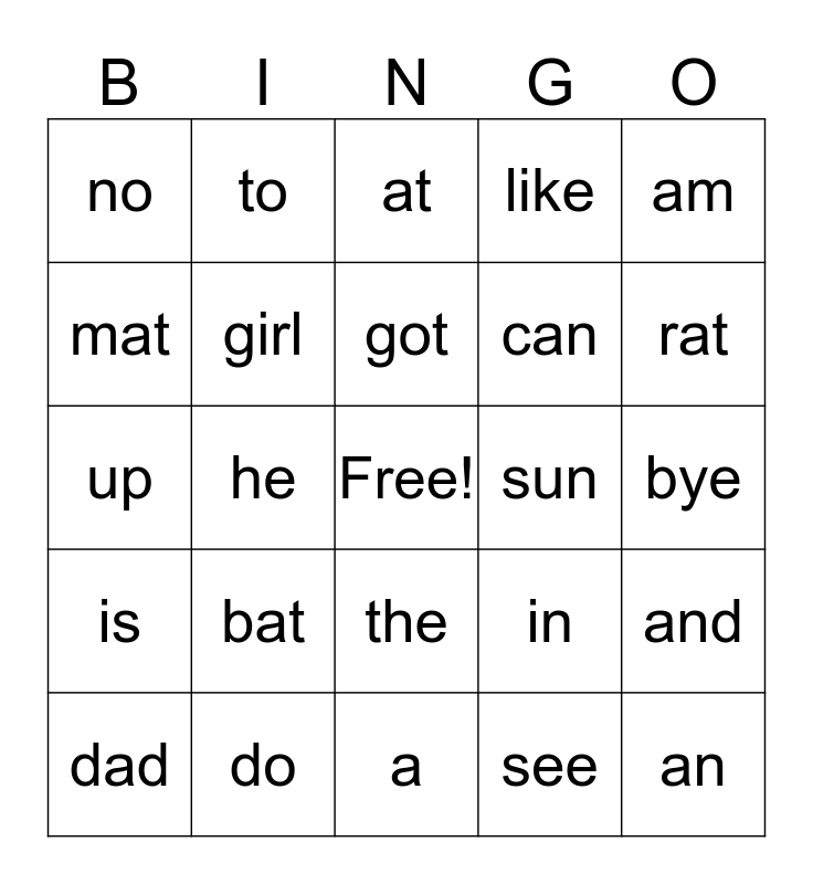 This bingo card has a free space and 31 words: a, cat, he, dog, no, at, girl, in, sun, see, bye, an, yes, I, rat, so, and, bat, is, the, am, it, dad, to, can, mat, like, up, do, got and me.