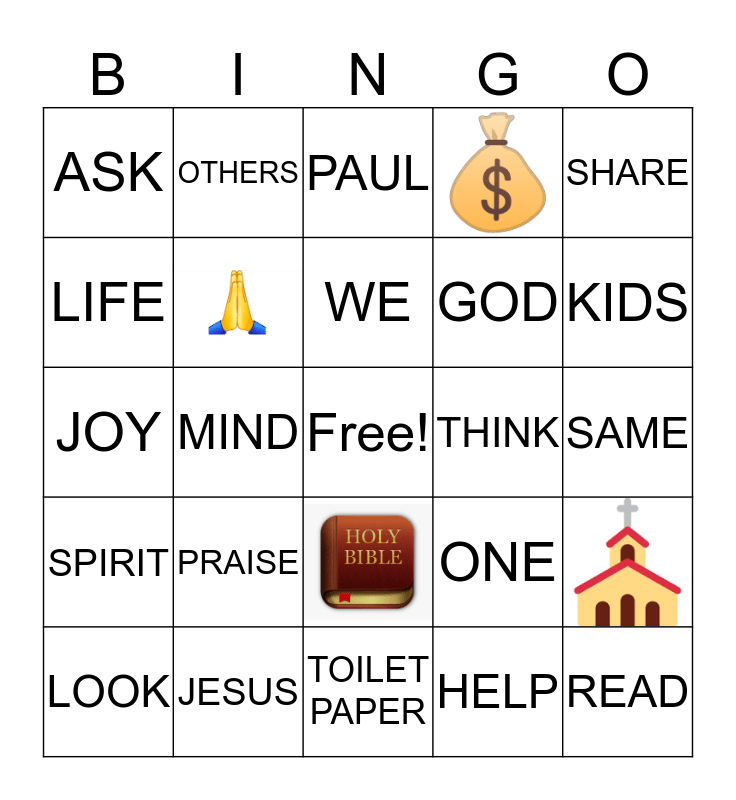 This bingo card has 4 images, a free space and 24 words: LOVE, GOD, HELP, LIFE, PAUL, OTHERS, SPIRIT, THINK, LOOK, JOY, JESUS, TOILET PAPER, KIDS, TODAY, PRAISE, WE, ASK, MY, READ, MIND, SAME, ONE, SHARE and TELL.