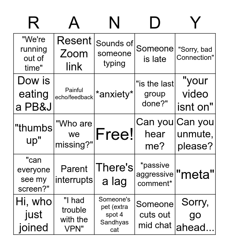 This bingo card has a free space and 29 words: Hi, who just joined, I'll email you a link, "Who are we missing?", "You're on the wring screen", "We're running out of time", Sounds of someone typing, Painful echo/feedback, Parent interrupts, Can you hear me?, "I had trouble with the VPN", Can you unmute, please?, Sorry, go ahead..., Someone's pet (extra spot 4 Sandhyas cat, Someone cuts out mid chat, "your video isnt on", "handles/ lenses", There's a lag, "can everyone see my screen?", "Sorry, bad Connection", "thumbs up", *passive aggressive comment*, "you should use this new software", "is the last group done?", Dow is eating a PB&J, Someone is late, Resent Zoom link, "meta", *anxiety* and someone using a headset.
