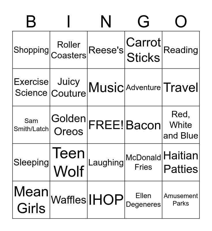 This bingo card has a free space and 24 words: Teen Wolf, Waffles, Music, Mean Girls, Reading, Shopping, Exercise Science, Roller Coasters, Bacon, Laughing, Adventure, Sam Smith/Latch, McDonald Fries, Haitian Patties, Juicy Couture, Ellen Degeneres, Red, White and Blue, Reese's, Travel, Golden Oreos, Amusement Parks, Sleeping, Carrot Sticks and IHOP.