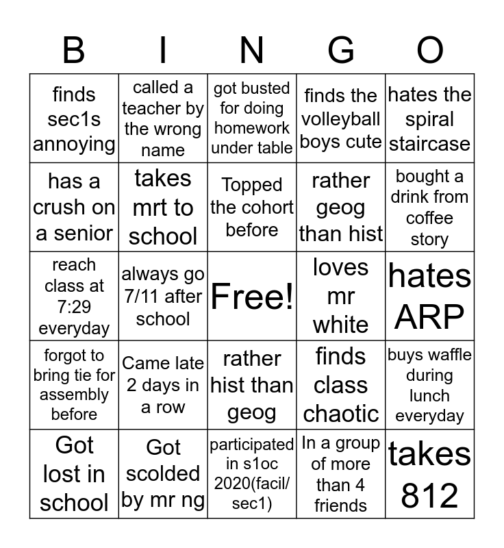 This bingo card has a free space and 24 words: Came late 2 days in a row, Got scolded by mr ng, Topped the cohort before, Got lost in school, hates the spiral staircase, finds sec1s annoying, has a crush on a senior, called a teacher by the wrong name, loves mr white, rather hist than geog, rather geog than hist, reach class at 7:29 everyday, finds class chaotic, buys waffle during lunch everyday, takes mrt to school, In a group of more than 4 friends, hates ARP, got busted for doing homework under table, bought a drink from coffee story, always go 7/11 after school, takes 812, forgot to bring tie for assembly before, finds the volleyball boys cute and participated in s1oc 2020(facil/ sec1).