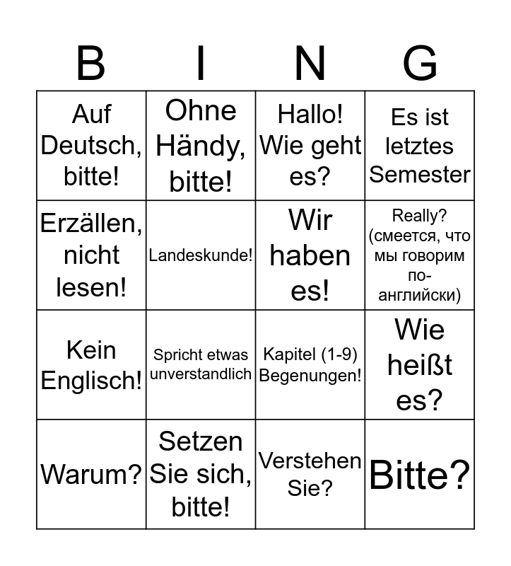 This bingo card has 16 words: Setzen Sie sich, bitte!, Wie heißt es?, Hallo! Wie geht es?, Auf Deutsch, bitte!, Kein Englisch!, Ohne Händy, bitte!, Kapitel (1-9) Begenungen!, Verstehen Sie?, Erzällen, nicht lesen!, Landeskunde!, Warum?, Es ist letztes Semester, Spricht etwas unverstandlich, Really? (смеется, что мы говорим по-английски), Wir haben es! and Bitte?.
