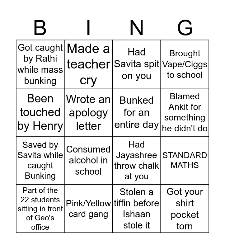 This bingo card has 16 words: Pink/Yellow card gang, STANDARD MATHS, Had Savita spit on you, Got caught by Rathi while mass bunking, Saved by Savita while caught Bunking, Made a teacher cry, Had Jayashree throw chalk at you, Stolen a tiffin before Ishaan stole it, Been touched by Henry, Wrote an apology letter, Part of the 22 students sitting in front of Geo's office, Brought Vape/Ciggs to school, Consumed alcohol in school, Blamed Ankit for something he didn't do, Bunked for an entire day and Got your shirt pocket torn.