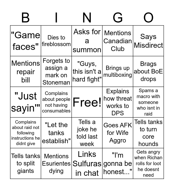 This bingo card has a free space and 24 words: "Let the tanks establish", Mentions Esurientes dying, "Guys, this isn't a hard fight", Tells tanks to split giants, Says Misdirect, "Game faces", Mentions repair bill, Dies to fireblossom, Explains how threat works to DPS, Tells a joke he told last week, Brings up multiboxing, "Just sayin'", Goes AFK for Wife Aggro, Tells tanks to turn core hounds, Forgets to assign a mark on Stoneman, "I'm gonna be honest...", Spams a macro with someone who isnt in raid, Asks for a summon, Brags about BoE drops, Complains about people not having consumables, Gets angry when Richan rolls for loot he doesnt need, Complains about raid not following instructions he didnt give, Mentions Canadian Club and Links Sulfuras in chat.