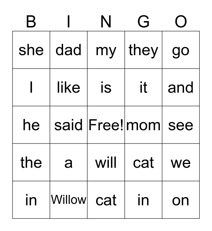 This bingo card has a free space and 24 words: a, Willow, is, in, go, she, I, dad, mom, will, it, he, cat, we, like, in, see, my, and, said, on, the, they and cat.