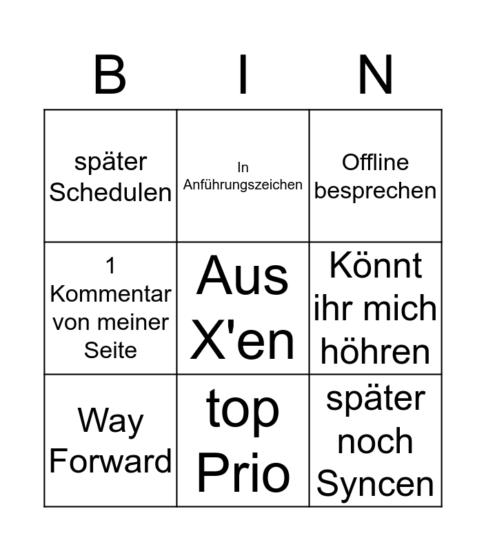 This bingo card has a free space and 9 words: Way Forward, Offline besprechen, In Anführungszeichen, 1 Kommentar von meiner Seite, später Schedulen, Könnt ihr mich höhren, später noch Syncen, Offtopic nehmen and top Prio.