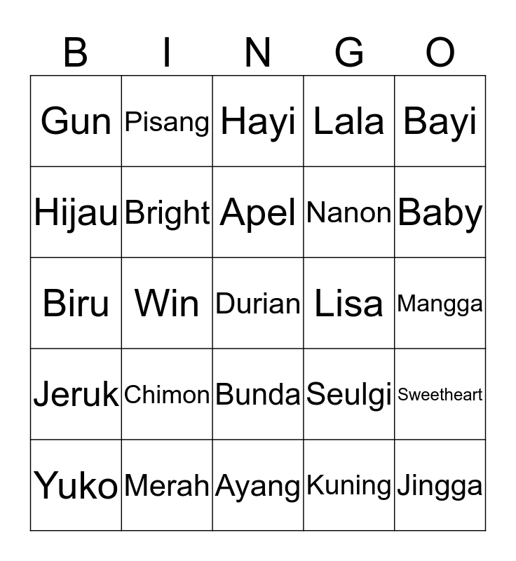 This bingo card has a free space and 24 words: Chimon, Merah, Apel, Yuko, Bayi, Gun, Hijau, Pisang, Lisa, Bunda, Nanon, Biru, Seulgi, Sweetheart, Bright, Kuning, Mangga, Hayi, Baby, Win, Jingga, Jeruk, Lala and Ayang.