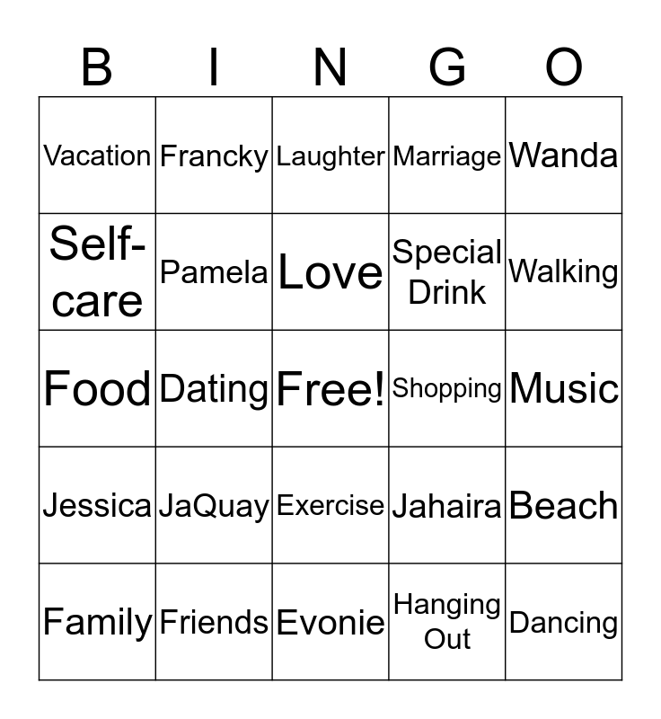 This bingo card has a free space and 24 words: JaQuay, Friends, Love, Family, Wanda, Vacation, Self-care, Francky, Shopping, Exercise, Special Drink, Food, Jahaira, Beach, Pamela, Hanging Out, Music, Laughter, Walking, Dating, Dancing, Jessica, Marriage and Evonie.