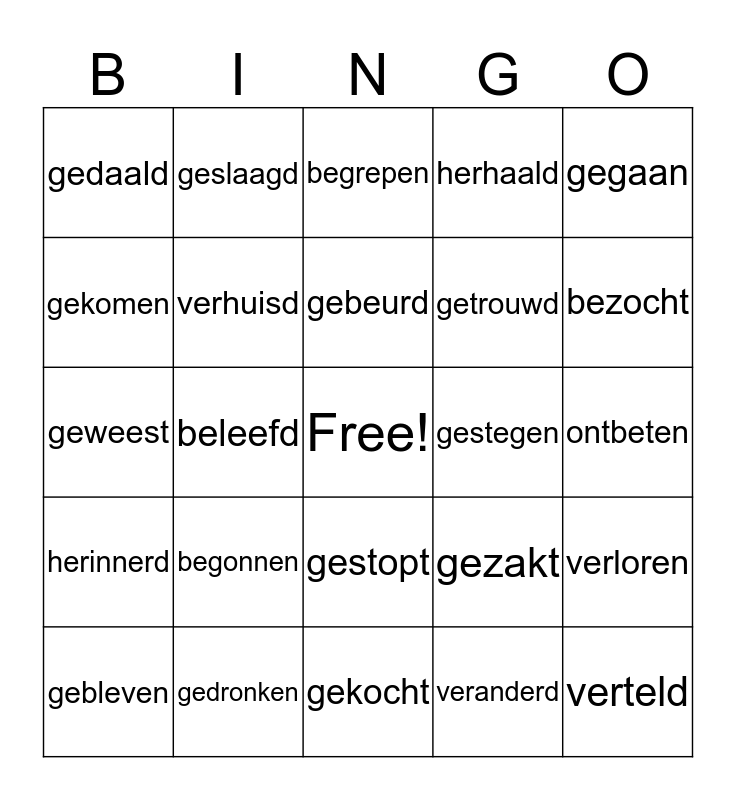 This bingo card has a free space and 24 words: begonnen, gedronken, gebeurd, gebleven, gegaan, gedaald, gekomen, geslaagd, gestegen, gestopt, getrouwd, geweest, gezakt, verloren, verhuisd, veranderd, ontbeten, begrepen, bezocht, beleefd, verteld, herinnerd, herhaald and gekocht.