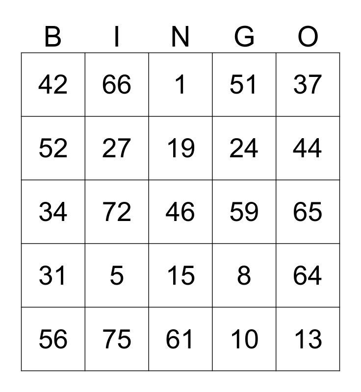 This bingo card has 25 words: 5, 61, 19, 56, 37, 42, 52, 66, 59, 15, 24, 34, 8, 64, 27, 13, 65, 1, 44, 72, 46, 75, 31, 51 and 10.