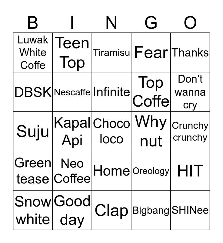 This bingo card has a free space and 24 words: Neo Coffee, Good day, Infinite, Snow white, Thanks, Luwak White Coffe, DBSK, Teen Top, Why nut, Home, Top Coffe, Suju, Oreology, HIT, Nescaffe, Bigbang, Crunchy crunchy, Tiramisu, Don’t wanna cry, Kapal Api, SHINee, Green tease, Fear and Clap.