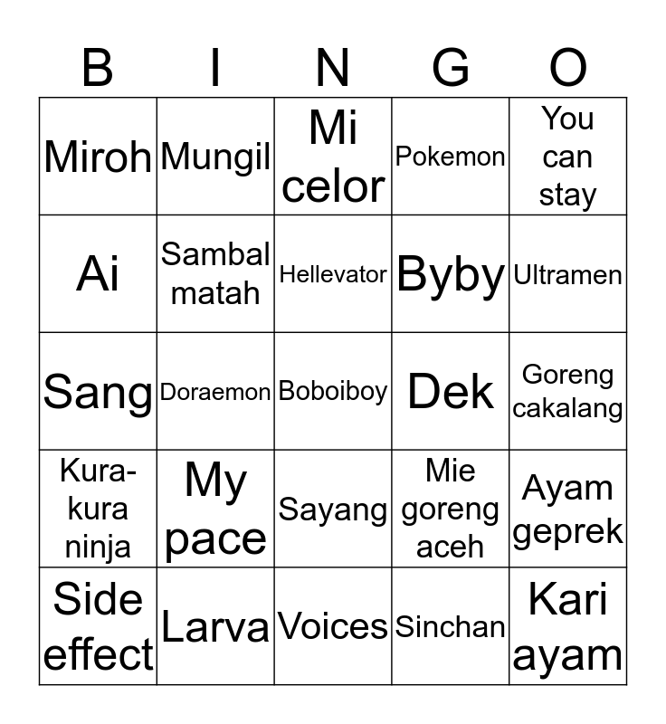 This bingo card has 25 words: My pace, Voices, Hellevator, Side effect, You can stay, Miroh, Ai, Mungil, Dek, Sayang, Byby, Sang, Mie goreng aceh, Ayam geprek, Sambal matah, Kari ayam, Goreng cakalang, Mi celor, Ultramen, Doraemon, Boboiboy, Larva, Kura-kura ninja, Pokemon and Sinchan.