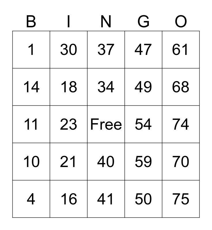 This bingo card has a free space and 24 words: 4, 21, 34, 50, 61, 1, 30, 37, 54, 74, 11, 18, 59, 70, 14, 16, 41, 47, 68, 10, 23, 40, 49 and 75.