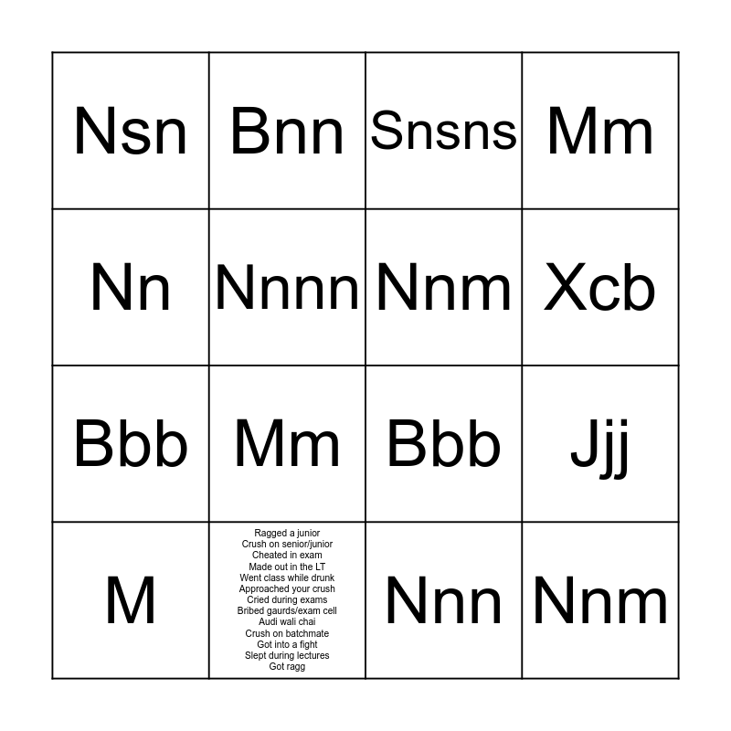 This bingo card has 16 words: Ragged a junior Crush on senior/junior Cheated in exam Made out in the LT Went class while drunk Approached your crush Cried during exams Bribed gaurds/exam cell Audi wali chai Crush on batchmate Got into a fight Slept during lectures Got ragg, Jjj, Snsns, Nsn, Bbb, Bnn, Bbb, Nnn, Nn, Nnnn, M, Mm, Mm, Xcb, Nnm and Nnm.