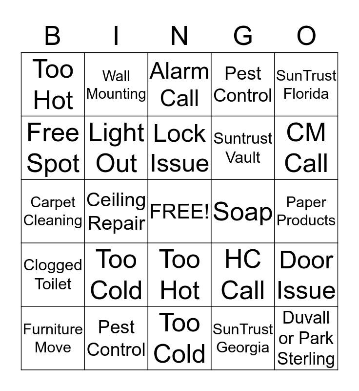 This bingo card has a free space and 24 words: Too Cold, Pest Control, Lock Issue, Furniture Move, SunTrust Florida, Too Hot, Free Spot, Wall Mounting, Soap, Too Hot, Suntrust Vault, Carpet Cleaning, HC Call, Door Issue, Light Out, SunTrust Georgia, Paper Products, Alarm Call, CM Call, Ceiling Repair, Duvall or Park Sterling, Clogged Toilet, Pest Control and Too Cold.