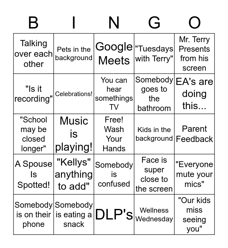 This bingo card has a free space and 24 words: "Kellys" anything to add", Somebody is eating a snack, You can hear somethings TV, Somebody is on their phone, Mr. Terry Presents from his screen, Talking over each other, "Is it recording", Pets in the background, Kids in the background, Somebody is confused, Somebody goes to the bathroom, "School may be closed longer", Face is super close to the screen, "Everyone mute your mics", Celebrations!, Wellness Wednesday, Parent Feedback, Google Meets, EA's are doing this..., Music is playing!, "Our kids miss seeing you", A Spouse Is Spotted!, "Tuesdays with Terry" and DLP's.