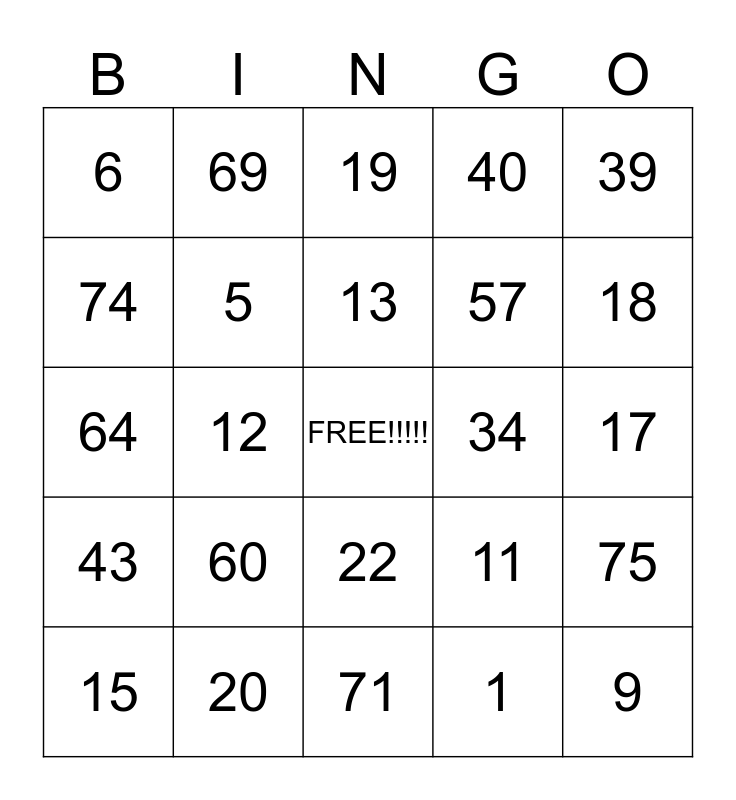 This bingo card has a free space and 24 words: 60, 20, 13, 15, 39, 6, 74, 69, 34, 22, 57, 64, 11, 75, 5, 1, 17, 19, 18, 12, 9, 43, 40 and 71.