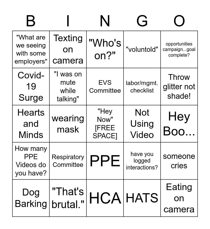 This bingo card has a free space and 24 words: Respiratory Committee, "That's brutal.", EVS Committee, Dog Barking, opportunities campaign...goal complete?, "What are we seeing with some employers", Covid-19 Surge, Texting on camera, Not Using Video, PPE, labor/mgmt. checklist, Hearts and Minds, have you logged interactions?, someone cries, "I was on mute while talking", HATS, Hey Boo..., "Who's on?", Throw glitter not shade!, wearing mask, Eating on camera, How many PPE Videos do you have?, "voluntold" and HCA.