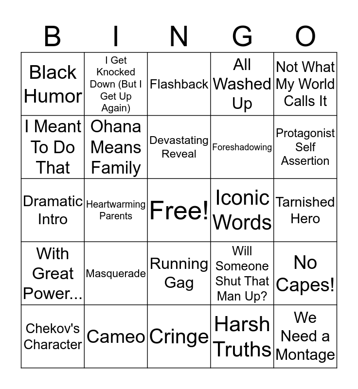 This bingo card has a free space and 36 words: Women Out Of Refrigerators, Death Of The Mentor, Well That's Wholesome, Ohana Means Family, Will Someone Shut That Man Up?, With Great Power..., Devastating Reveal, Looney Tunes, Not What My World Calls It, Embarrassed By Parents, Heartwarming Parents, All Washed Up, Iconic Shot, Iconic Words, Protagonist Self Assertion, Black Humor, Snark Master, Masquerade, We Need a Montage, Flashback, Tarnished Hero, No Capes!, Cameo, Chekov's Character, Cringe, I Get Knocked Down (But I Get Up Again), Dramatic Intro, The Nerd, Foreshadowing, I Meant To Do That, Breaking The Fourth Wall, Callback, Harsh Truths, Running Gag, Dramatic Slow Mo and Fatphobia.