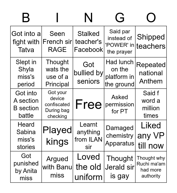 This bingo card has a free space and 24 words: Got punished by Anita miss, Played kings, Got bullied by seniors, Thought Jerald sir is gay, Shipped teachers, Got into a fight with Tatva, Seen French sir RAGE, Stalked teacher's Facebook, Asked permission for PT, Said f word a million times, Got into A section B section battle, Thought wats the use of a Principal, Damaged chemistry Apparatus, Liked any VP till now, Slept in Shyla miss's period, Argued with Banu miss, Loved the old uniform, Said par instead of 'POWER' in the prayer, Repeated national Anthem, Heard Sabina miss's stories, Got your device confiscated During bag checking, Learnt anything from ILAN sir, Had lunch on the platform in the ground and Thought why Ruchi ma'am had more authority.