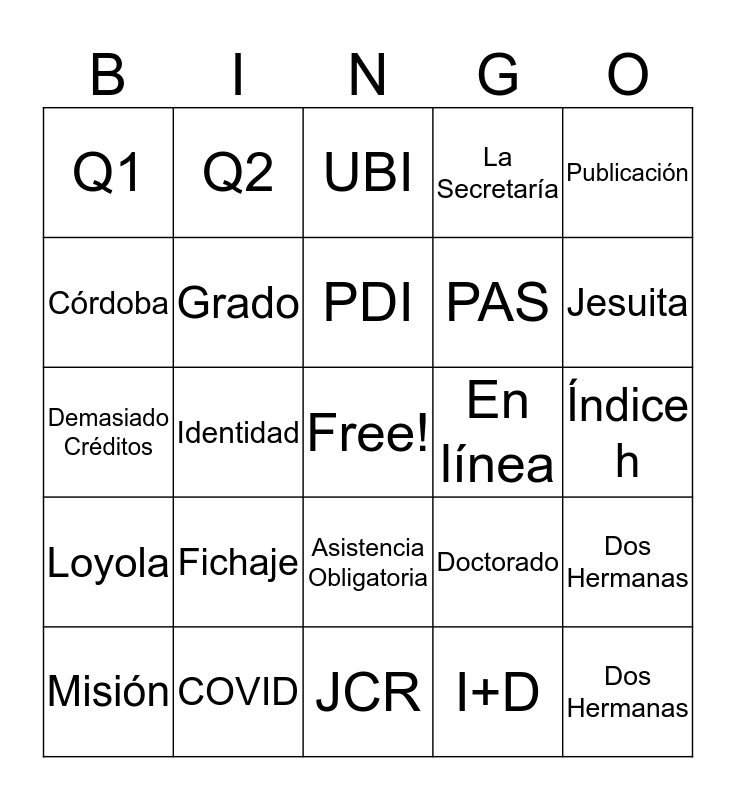 This bingo card has a free space and 25 words: Loyola, COVID, JCR, I+D, Publicación, Q1, Q2, UBI, En línea, Dos Hermanas, Córdoba, Grado, Máster, Doctorado, Jesuita, Misión, Identidad, PDI, PAS, Índice h, Demasiado Créditos, Fichaje, Asistencia Obligatoria, La Secretaría and Dos Hermanas.