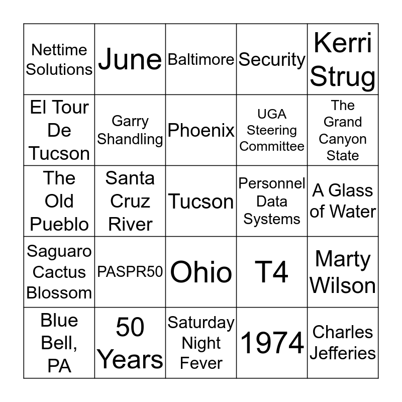 This bingo card has a free space and 32 words: 1974, 32, Santa Cruz River, University of Arizona, Saguaro Cactus Blossom, Garry Shandling, Kerri Strug, Marty Wilson, June, 2009, Phoenix, Baltimore, Enterprise Server, Ken Tarone, Personnel Data Systems, New Orleans, Blue Bell, PA, The Old Pueblo, Ohio, PASPR50, T4, Scuba Diving, A Glass of Water, 50 Years, Charles Jefferies, Security, UGA Steering Committee, El Tour De Tucson, Nettime Solutions, Saturday Night Fever, Mountain Standard Time and The Grand Canyon State.