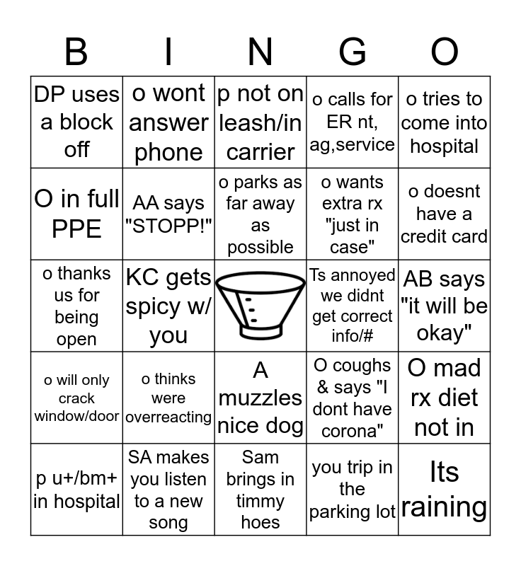 This bingo card has a free space and 24 words: o thinks were overreacting, SA makes you listen to a new song, o parks as far away as possible, p u+/bm+ in hospital, o tries to come into hospital, DP uses a block off, O in full PPE, o wont answer phone, Ts annoyed we didnt get correct info/#, A muzzles nice dog, o wants extra rx "just in case", o thanks us for being open, O coughs & says "I dont have corona", O mad rx diet not in, AA says "STOPP!", you trip in the parking lot, AB says "it will be okay", p not on leash/in carrier, o doesnt have a credit card, KC gets spicy w/ you, Its raining, o will only crack window/door, o calls for ER nt, ag,service and Sam brings in timmy hoes.