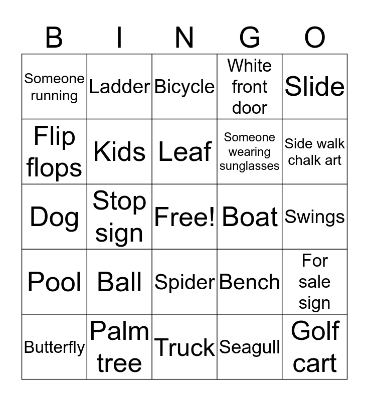 This bingo card has a free space and 29 words: Butterfly, Clouds, Stop sign, Street light, Someone running, Bicycle, Kids, Ball, Boat, Palm tree, Swings, Golf cart, Truck, Seagull, Side walk chalk art, Potted plant, Spider, Pool, Slide, Dog, Bench, Flowers, Someone wearing sunglasses, Flip flops, White front door, Ladder, For sale sign, Leaf and Ant hill.