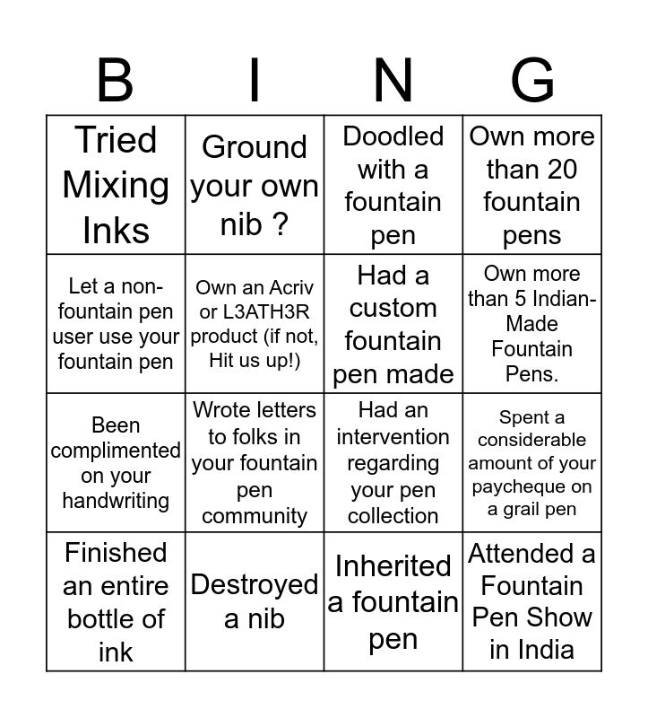 This bingo card has 16 words: Destroyed a nib, Spent a considerable amount of your paycheque on a grail pen, Doodled with a fountain pen, Tried Mixing Inks, Been complimented on your handwriting, Ground your own nib ?, Had an intervention regarding your pen collection, Inherited a fountain pen, Let a non-fountain pen user use your fountain pen, Own an Acriv or L3ATH3R product (if not, Hit us up!), Finished an entire bottle of ink, Own more than 20 fountain pens, Wrote letters to folks in your fountain pen community, Own more than 5 Indian-Made Fountain Pens., Had a custom fountain pen made and Attended a Fountain Pen Show in India.