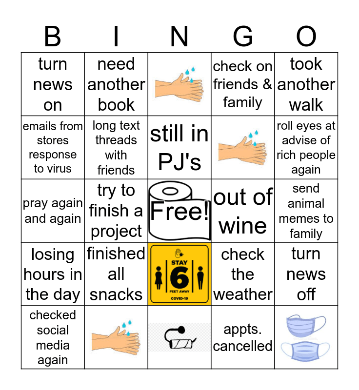 This bingo card has 6 images, a free space and 18 words: finished all snacks, still in PJ's, checked social media again, took another walk, turn news on, emails from stores response to virus, need another book, out of wine, pray again and again, check the weather, turn news off, long text threads with friends, appts. cancelled, send animal memes to family, roll eyes at advise of rich people again, try to finish a project, losing hours in the day and check on friends & family.