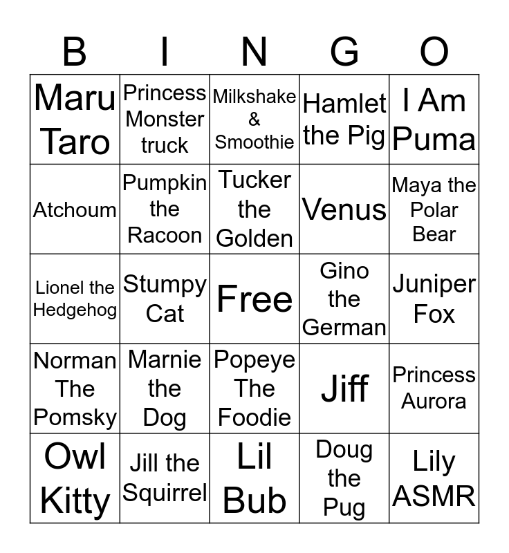 This bingo card has a free space and 27 words: Jiff, Grumpy Cat, Venus, Lil Bub, Atchoum, Milkshake & Smoothie, Princess Monster truck, Norman The Pomsky, Gino the German, Princess Aurora, Lionel the Hedgehog, Hamlet the Pig, Owl Kitty, Jill the Squirrel, Maya the Polar Bear, Pooky the munchkin, Pumpkin the Racoon, Tucker the Golden, Marnie the Dog, Maru Taro, Juniper Fox, Doug the Pug, Stumpy Cat, Lily ASMR, Popeye The Foodie, I Am Puma and BuBu the Chinchilla.