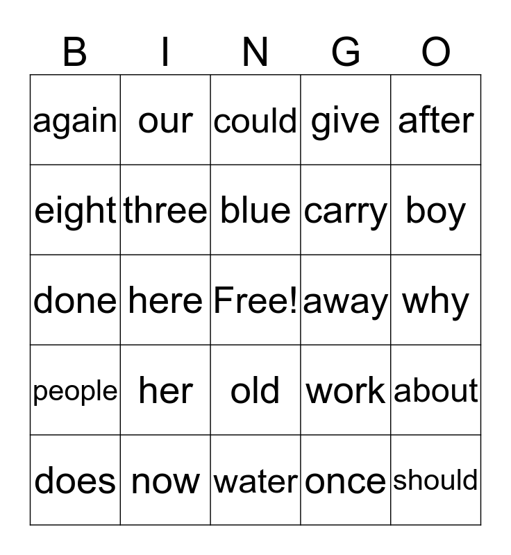 This bingo card has a free space and 29 words: does, down, here, where, again, could, three, her, away, now, why, should, water, once, boy, how, old, people, after, done, work, animal, carry, eight, give, our, about, blue and other.