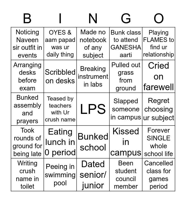 This bingo card has a free space and 24 words: Eating lunch in 0 period, Peeing in swimming pool, Breaking instrument in labs, Writing crush name in toilet, Playing FLAMES to find ur relationship, Noticing Naveen sir outfit in events, Arranging desks before exam, OYES & aam papad was ur daily thing, Slapped someone in campus, Bunked school, Pulled out grass from ground, Bunked assembly and prayers, Kissed in campus, Forever SINGLE whole school life, Scribbled on desks, Been student council member, Regret choosing ur subject, Made no notebook of any subject, Cried on farewell, Teased by teachers with Ur crush name, Cancelled class for games period, Took rounds of ground for being late, Bunk class to attend GANESHA aarti and Dated senior/ junior.