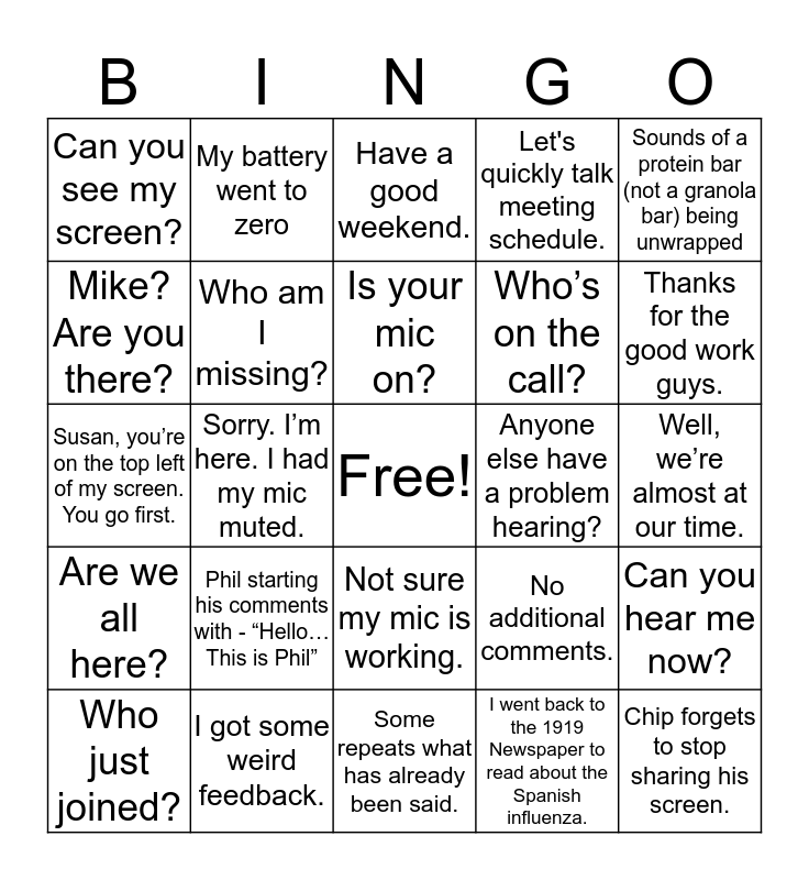 This bingo card has a free space and 24 words: Phil starting his comments with - “Hello…This is Phil”, I got some weird feedback., Is your mic on?, Who just joined?, Sounds of a protein bar (not a granola bar) being unwrapped, Can you see my screen?, Mike? Are you there?, My battery went to zero, Anyone else have a problem hearing?, Not sure my mic is working., Who’s on the call?, Susan, you’re on the top left of my screen. You go first., No additional comments., Can you hear me now?, Who am I missing?, I went back to the 1919 Newspaper to read about the Spanish influenza., Well, we’re almost at our time., Have a good weekend., Thanks for the good work guys., Sorry. I’m here. I had my mic muted., Chip forgets to stop sharing his screen., Are we all here?, Let's quickly talk meeting schedule. and Some repeats what has already been said..