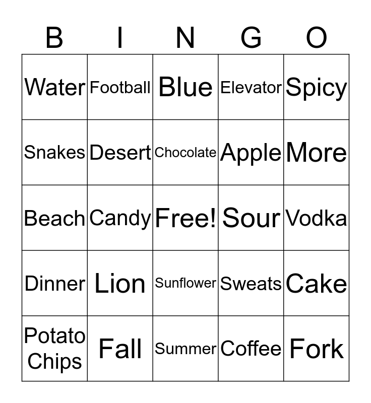 This bingo card has a free space and 24 words: Lion, Fall, Chocolate, Potato Chips, Spicy, Water, Snakes, Football, Sour, Sunflower, Apple, Beach, Sweats, Cake, Desert, Coffee, Vodka, Blue, More, Candy, Fork, Dinner, Elevator and Summer.