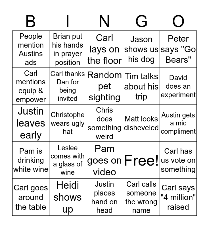 This bingo card has 25 words: Leslee comes with a glass of wine, Justin places hand on head, Random pet sighting, Carl goes around the table, Peter says "Go Bears", People mention Austins ads, Carl mentions equip & empower, Brian put his hands in prayer position, Matt looks disheveled, Pam goes on video, Tim talks about his trip, Justin leaves early, Free!, Carl has us vote on something, Carl thanks Dan for being invited, Carl says "4 million" raised, Austin gets a mic compliment, Carl lays on the floor, David does an experiment, Christophe wears ugly hat, Chris does something weird, Heidi shows up, Pam is drinking white wine, Jason shows us his dog and Carl calls someone the wrong name.