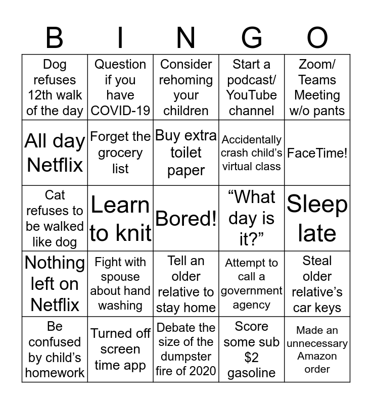 This bingo card has a free space and 24 words: Fight with spouse about hand washing, Turned off screen time app, Buy extra toilet paper, Be confused by child’s homework, Zoom/ Teams Meeting w/o pants, Dog refuses 12th walk of the day, All day Netflix, Question if you have COVID-19, “What day is it?”, Tell an older relative to stay home, Accidentally crash child’s virtual class, Cat refuses to be walked like dog, Attempt to call a government agency, Steal older relative’s car keys, Forget the grocery list, Score some sub $2 gasoline, Sleep late, Consider rehoming your children, FaceTime!, Learn to knit, Made an unnecessary Amazon order, Nothing left on Netflix, Start a podcast/ YouTube channel and Debate the size of the dumpster fire of 2020.
