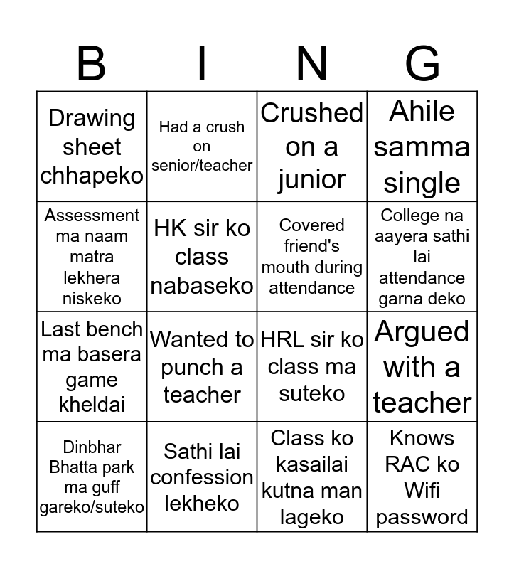 This bingo card has 16 words: Dinbhar Bhatta park ma guff gareko/suteko, Sathi lai confession lekheko, Crushed on a junior, Ahile samma single, Assessment ma naam matra lekhera niskeko, Had a crush on senior/teacher, HRL sir ko class ma suteko, Argued with a teacher, Drawing sheet chhapeko, HK sir ko class nabaseko, Class ko kasailai kutna man lageko, College na aayera sathi lai attendance garna deko, Last bench ma basera game kheldai, Wanted to punch a teacher, Covered friend's mouth during attendance and Knows RAC ko Wifi password.