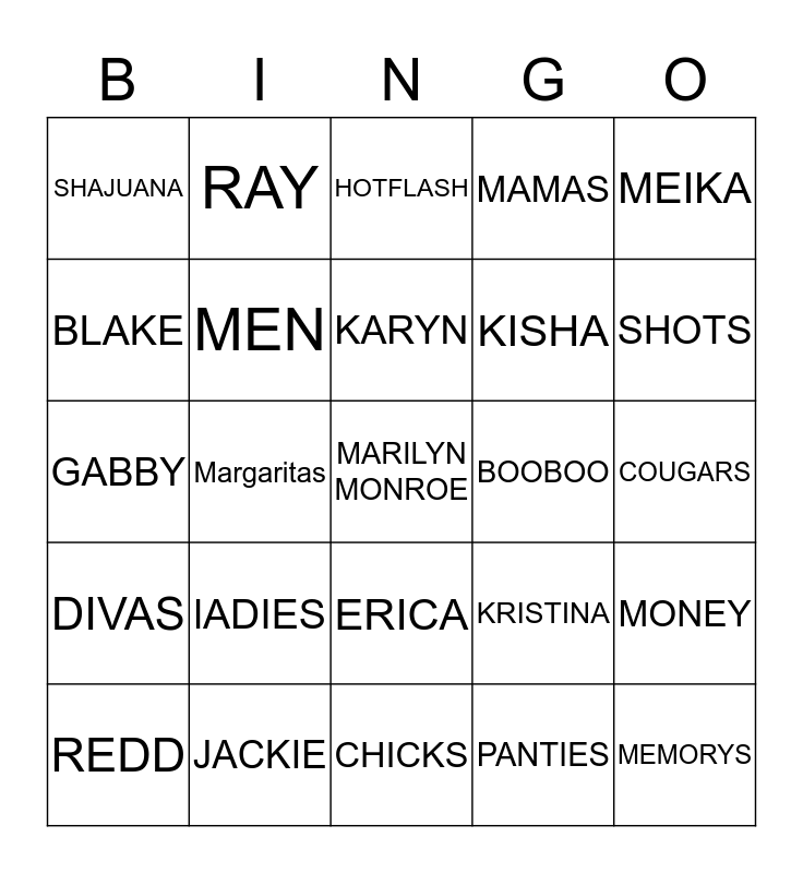 This bingo card has a free space and 24 words: lADIES, JACKIE, KARYN, REDD, MEIKA, SHAJUANA, BLAKE, RAY, BOOBOO, ERICA, KISHA, GABBY, KRISTINA, MONEY, MEN, PANTIES, COUGARS, HOTFLASH, SHOTS, Margaritas, MEMORYS, DIVAS, MAMAS and CHICKS.