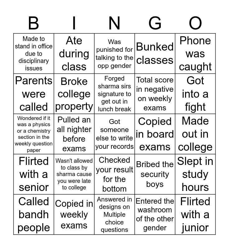 This bingo card has a free space and 24 words: Wasn't allowed to class by sharma cause you were late to college, Copied in weekly exams, Forged sharma sirs signature to get out in lunch break, Called bandh people, Phone was caught, Made to stand in office due to disciplinary issues, Parents were called, Ate during class, Copied in board exams, Checked your result for the bottom, Total score in negative on weekly exams, Wondered if it was a physics or a chemistry section in the weekly question paper, Bribed the security boys, Slept in study hours, Broke college property, Entered the washroom of the other gender, Made out in college, Was punished for talking to the opp gender, Got into a fight, Pulled an all nighter before exams, Flirted with a junior, Flirted with a senior, Bunked classes and Answered in designs on Multiple choice questions.