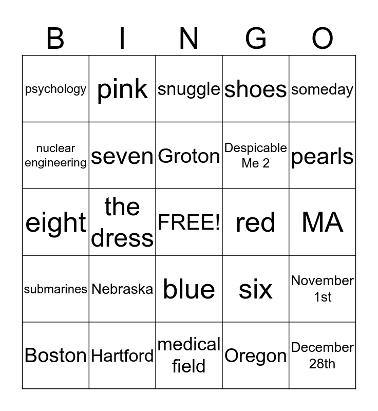 This bingo card has a free space and 24 words: Nebraska, Hartford, Groton, Boston, someday, psychology, nuclear engineering, pink, red, blue, Despicable Me 2, eight, six, November 1st, seven, Oregon, MA, snuggle, pearls, the dress, December 28th, submarines, shoes and medical field.