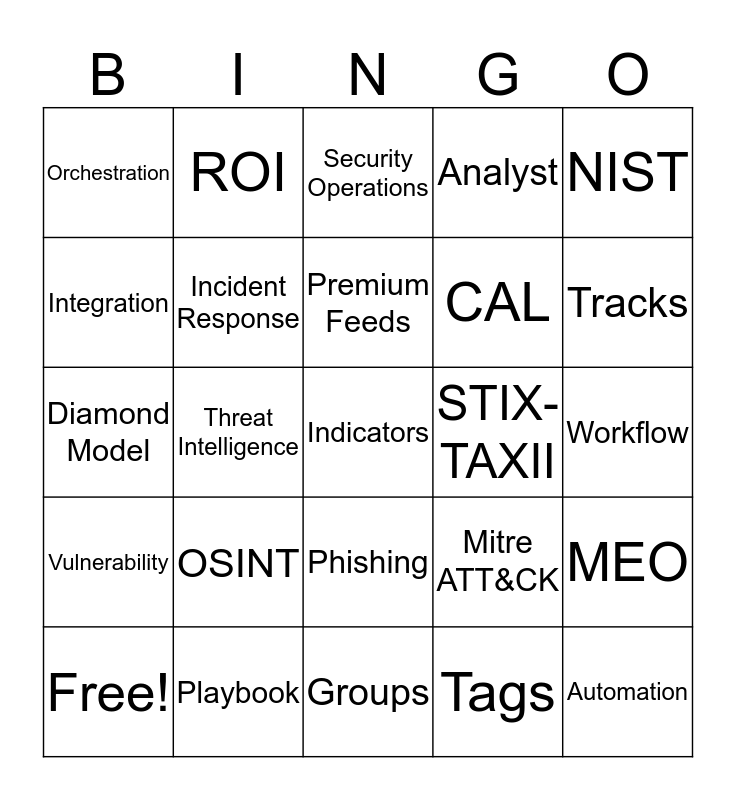 This bingo card has 29 words: Free!, SOAR, Threat Intelligence, Automation, Orchestration, Security Operations, Incident Response, OSINT, STIX-TAXII, Playbook, Workflow, Indicators, Groups, Tags, Tracks, Victims, Phishing, Vulnerability, NIST, Diamond Model, Mitre ATT&CK, Kill Chain, CAL, Integration, Analyst, ROI, MEO, Premium Feeds and Dashboards.