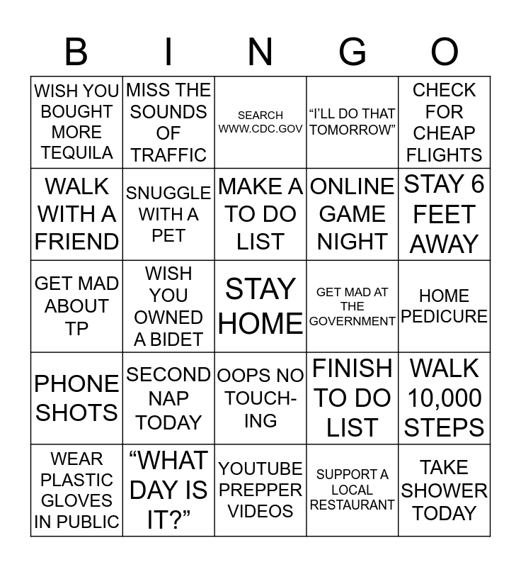 This bingo card has a free space and 35 words: COOK A NEW RECIPE, CRY FOR NO REASON, REWATCH A SERIES, SNUGGLE WITH A PET, OOPS NO TOUCH-ING, “I’LL DO THAT TOMORROW”, WALK WITH A FRIEND, TAKE AN ONLINE CLASS, MAKE A TO DO LIST, VIDEO CHAT W/ 2+PEOPLE, GET MAD ABOUT TP, CHECK FOR CHEAP FLIGHTS, CRY FOR ALL THE REASONS, EXERCISE AT HOME, WISH YOU BOUGHT MORE TEQUILA, GET MAD AT THE GOVERNMENT, SUPPORT A LOCAL RESTAURANT, WISH YOU OWNED A BIDET, PHONE SHOTS, TAKE SHOWER TODAY, FINISH TO DO LIST, WEAR PLASTIC GLOVES IN PUBLIC, WALK 10,000 STEPS, “WHAT DAY IS IT?”, SEARCH WWW.CDC.GOV, STAY 6 FEET AWAY, CLEAN A CLOSET, FREEZER SURPRISE!, ONLINE GAME NIGHT, HOME PEDICURE, WISH YOU OWNED A CABIN, YOUTUBE PREPPER VIDEOS, SECOND NAP TODAY, MISS THE SOUNDS OF TRAFFIC and PUT ON PANTS.
