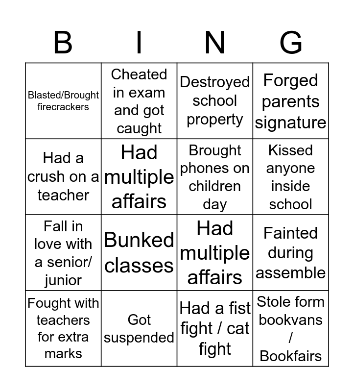 This bingo card has 16 words: Got suspended, Fainted during assemble, Destroyed school property, Blasted/Brought firecrackers, Fall in love with a senior/ junior, Cheated in exam and got caught, Had multiple affairs, Had a fist fight / cat fight, Had a crush on a teacher, Had multiple affairs, Fought with teachers for extra marks, Forged parents signature, Bunked classes, Kissed anyone inside school, Brought phones on children day and Stole form bookvans / Bookfairs.