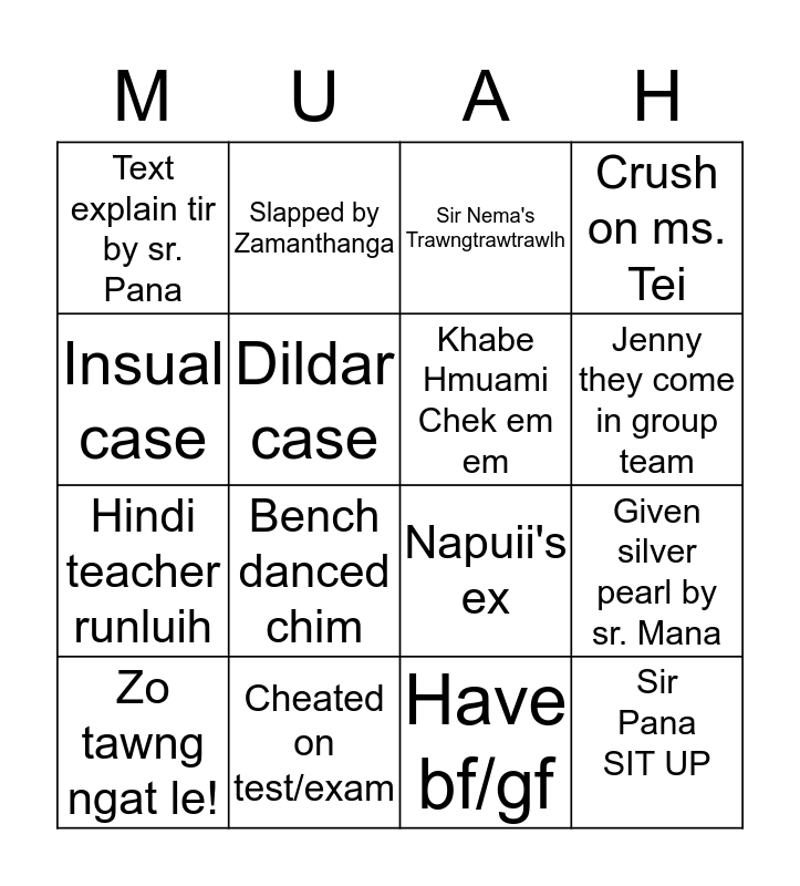 This bingo card has 16 words: Cheated on test/exam, Given silver pearl by sr. Mana, Sir Nema's Trawngtrawtrawlh, Text explain tir by sr. Pana, Hindi teacher runluih, Slapped by Zamanthanga, Napuii's ex, Have bf/gf, Insual case, Dildar case, Zo tawng ngat le!, Crush on ms. Tei, Bench danced chim, Jenny they come in group team, Khabe Hmuami Chek em em and Sir Pana SIT UP.