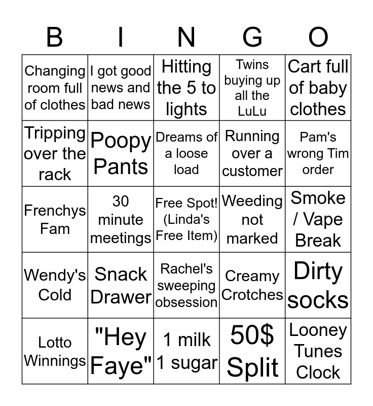 This bingo card has a free space and 34 words: Can I leave early?, 50$ Split, Accident in the Bathroom, Cover Cash, Wendy's Cold, Poopy Pants, Cart full of baby clothes, Lotto Winnings, I got good news and bad news, Missing a Drop, Dreams of a loose load, Hitting the 5 to lights, Tripping over coffee cups, Hump Day!, Weeding not marked, Pam's wrong Tim order, "Hey Faye", Frenchys Fam, Snack Drawer, Creamy Crotches, Rachel's sweeping obsession, Nonstop Saturdays, Changing room full of clothes, Smoke / Vape Break, 1 milk 1 sugar, Looney Tunes Clock, Twins buying up all the LuLu, Can I get a discount?, Running over a customer, Tripping over the rack, Don't forget the Salt Log, 30 minute meetings, Dirty socks and Margaret's morning coffee.