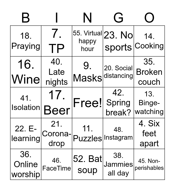 This bingo card has a free space and 63 words: 1.Netflix, 2. Laundry, 3. Zoom, 4. Six feet apart, 5. Family, 6. Virtual, 7. TP, 8. Hand Sanitizer, 9. Masks, 10. Video Games, 11. Puzzles, 12. Online Shopping, 13. Binge-watching, 14. Cooking, 15. Drinking, 16. Wine, 17. Beer, 18. Praying, 19. COVID, 20. Social distancing, 21. Corona-drop, 22. E-learning, 23. No sports, 24. Cancellations, 25. Essential worker, 26. Layoffs, 27. Unemployment, 28. Homeschooling, 29. Arts&crafts, 30. #hashtag, 31. TikTok, 32. YouTube, 33. Google hangouts, 34. Dog-walking, 35. Broken couch, 36. Online worship, 37. Take-out, 38. Jammies all day, 39. Bored, 40. Late nights, 41. Isolation, 42. Spring break?, 43. No school, 44. Home workouts, 45. Non-perishables, 46. FaceTime, 47. Snapchat, 48. Instagram, 49. Music, 50. Spoiled pets, 51. Wuhan, 52. Bat soup, 53. Work-from-home, 54. Max screen time, 55. Home haircuts, 55. Virtual happy hour, 56. Hand washing, 57. Empty shelves, 56. Gloves, 57. Couch potatoes, 58. Sidewalk chalk, 59. Hope and 60. God’s got us!.