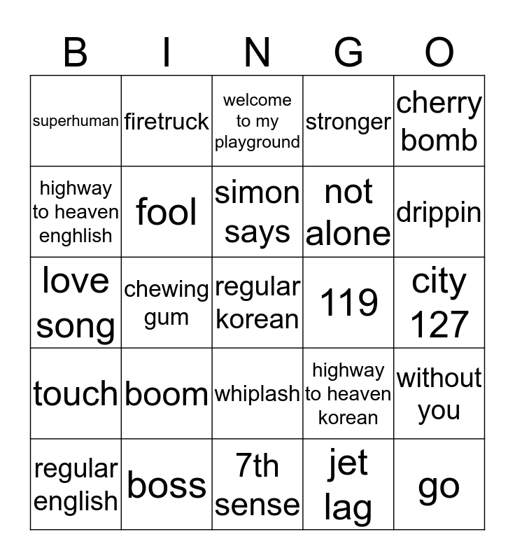 This bingo card has a free space and 24 words: boom, boss, simon says, regular english, cherry bomb, superhuman, highway to heaven enghlish, firetruck, 119, whiplash, not alone, love song, highway to heaven korean, without you, fool, jet lag, city 127, welcome to my playground, drippin, chewing gum, go, touch, stronger and 7th sense.