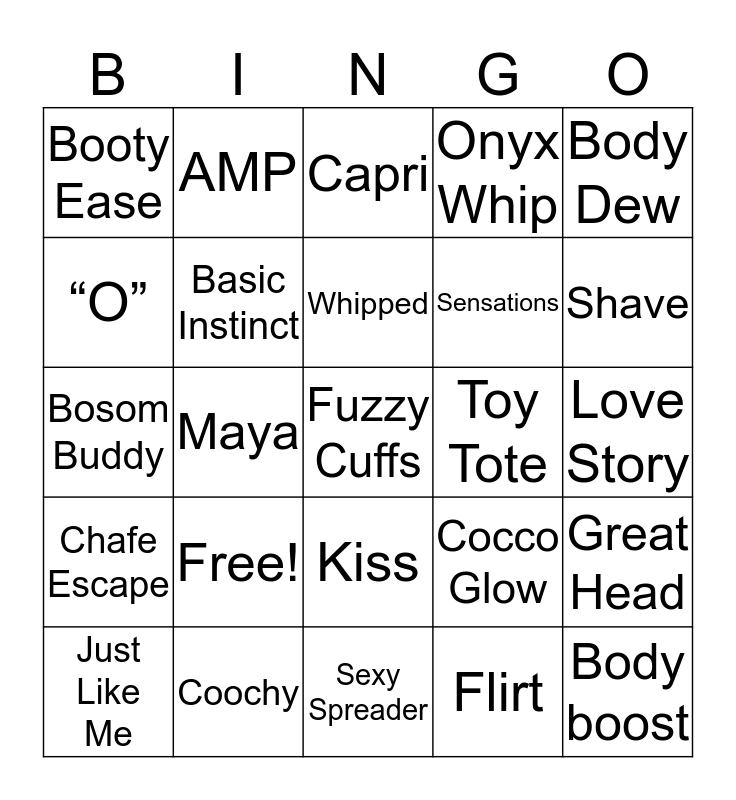 This bingo card has a free space and 24 words: Free!, Coochy, Whipped, Just Like Me, Body Dew, Booty Ease, “O”, AMP, Toy Tote, Kiss, Sensations, Bosom Buddy, Cocco Glow, Great Head, Basic Instinct, Flirt, Love Story, Capri, Shave, Maya, Body boost, Chafe Escape, Onyx Whip and Sexy Spreader.