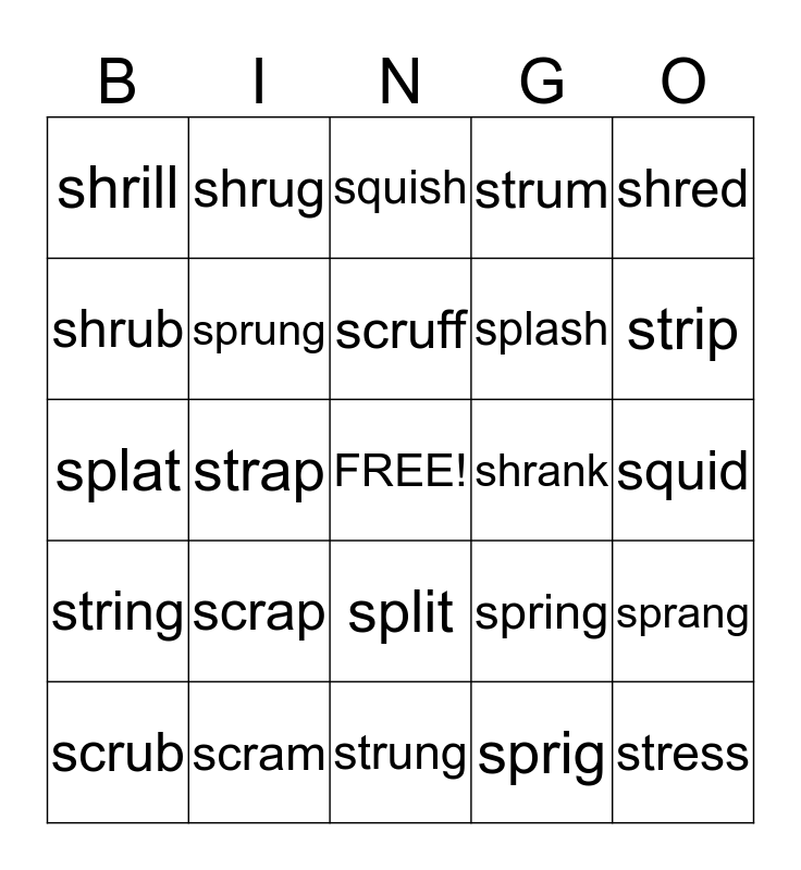 This bingo card has a free space and 24 words: scrap, scram, scruff, scrub, shred, shrill, shrub, shrug, shrank, split, splash, splat, spring, sprang, sprung, sprig, squid, squish, strip, strap, stress, string, strum and strung.
